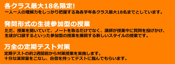 小学生・中学生には、福岡県立高校のトップ校への入学を目標とした『学校内容+one』の授業を展開し、高校生には『全国へ羽ばたけ!』を理念として、大都市への進学も見据えた個別指導を展開。