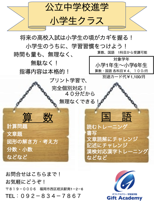 日本の将来を担う今の子供達には知識習得はもちろんですが、それだけでなく精神力を鍛える必要があります。Giftアカデミーでは、知識提供を行い、受験という大きな目標に向かって努力してもらう環境を提供しております。また、小学生のうちから『個』と『仲間』の両方を意識してもらいたいと思っております。